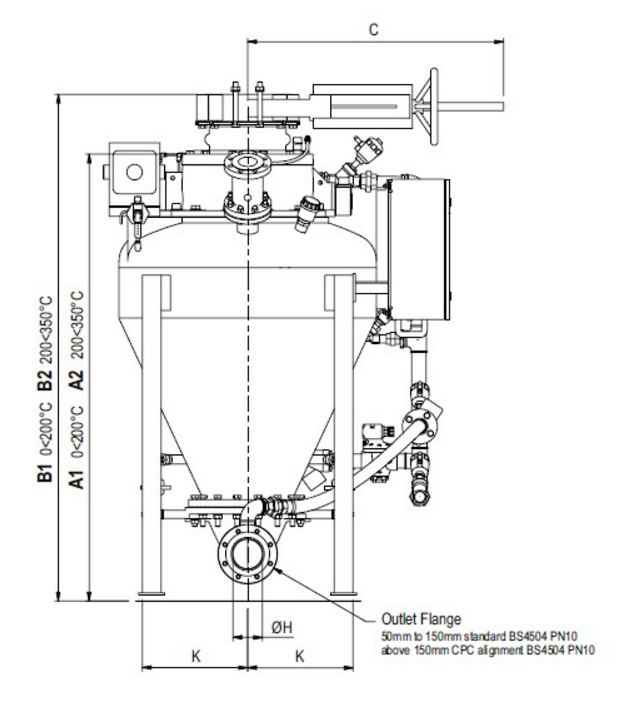 一般這個(gè)閥門安裝在一組或兩組密相泵的出口。該閥門中的兩臺圓頂閥分別進(jìn)行工作。當(dāng)兩個(gè)接收倉距離較近,體積差不多可以選擇庫頂切斷閥。