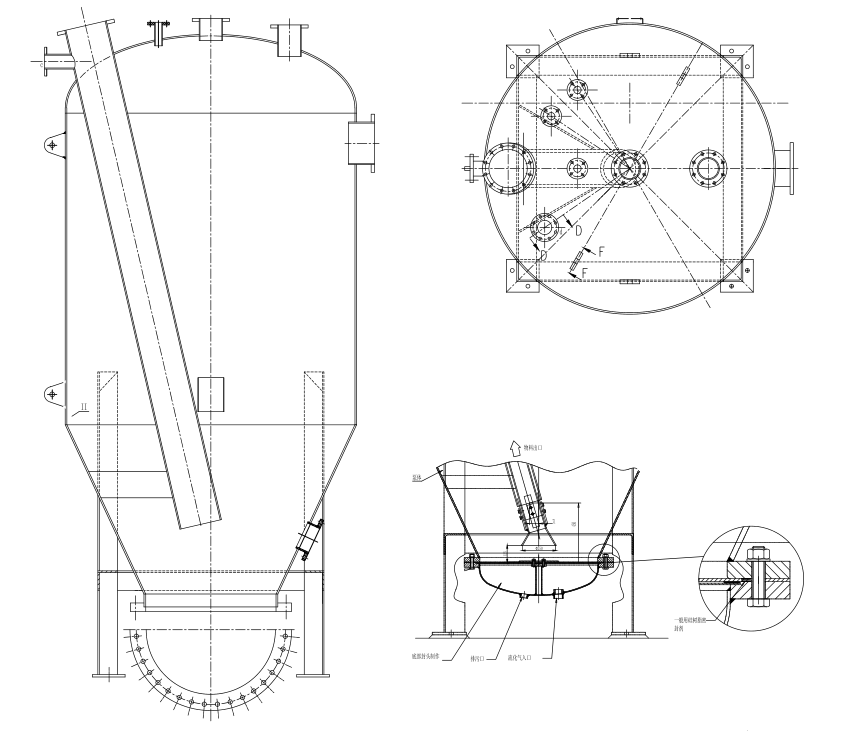TD泵主要結(jié)構(gòu)是由壓力容器泵體與底部封頭組成,在底部封頭有進氣口,封頭內(nèi)部由流化裝置,統(tǒng)稱為流化盤。流化盤由氣化膜、氣化組件等一些生產(chǎn)工藝而成。一系列元件可對流化盤上方的物料進行充分流化,從而從倉泵內(nèi)部的管路送出,泵體上分別有多處進氣點,多進氣的特點確保物料在輸送過程中的充分流化,使其輸送保持穩(wěn)定。由于特殊的配置以及倉泵內(nèi)部下喇叭口的形式,有效解決了出料速度快、易控制、濃相、不積料等特點,可進行遠距離輸送。